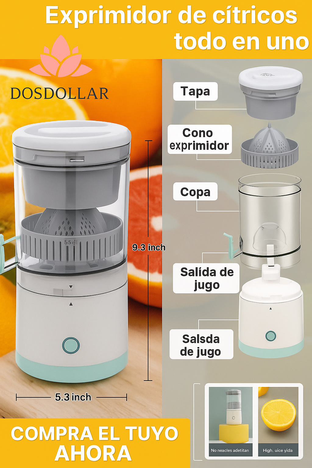 Diseño moderno, batería recargable y sistema automático: exprime naranjas, mandarinas o limones con solo presionar un botón. ¡Ideal para tu cocina, oficina o incluso al aire libre! 🌿